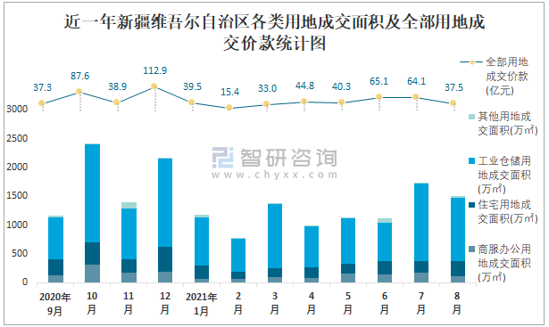近一年新疆維吾爾自治區(qū)各類用地成交面積及全部用地成交價款統(tǒng)計圖