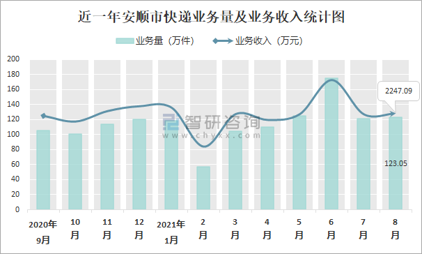 2021年8月安順市快遞業(yè)務(wù)量與業(yè)務(wù)收入分別為123.05萬(wàn)件和2247.09萬(wàn)元