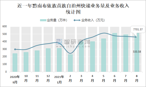 近一年黔南布依族苗族自治州快遞業務量及業務收入統計圖