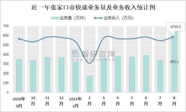 2021年8月張家口市快遞業務量與業務收入分別為651.1萬件和6759.3萬元