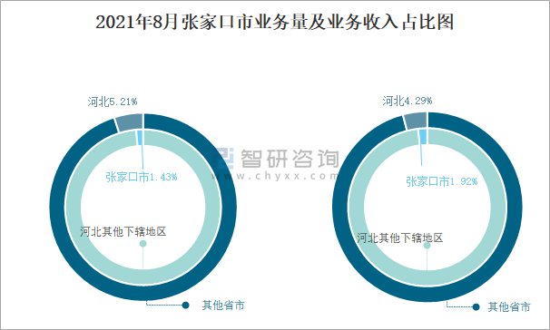 根據各省市郵政局數據可知:2021年8月張家口市快遞業務量占河北快遞業務量的1.43%,河北快遞業務量占全國快遞業務量的5.21%;2021年8月張家口市快遞業務收入占河北快遞業務收入的1.92%,河北快遞業務收入占全國快遞業務收入的4.29%。