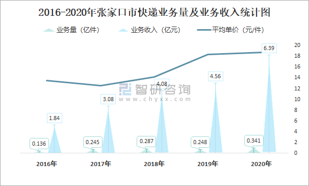 2016-2020年張家口市快遞業務量及業務收入統計圖