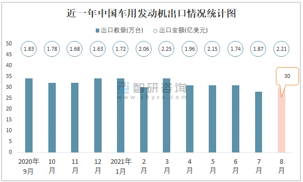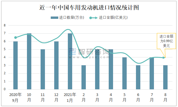 根據(jù)中國海關(guān)數(shù)據(jù)顯示:2021年8月中國車用發(fā)動(dòng)機(jī)進(jìn)口數(shù)量為3萬臺(tái),同比下降51.3%,進(jìn)口金額為0.99億美元,同比下降38.5%,2021年8月中國車用發(fā)動(dòng)機(jī)出口數(shù)量為30萬臺(tái),同比下降18.4%,出口金額為2.21億美元,同比增長36.6%;2021年1-8月中國車用發(fā)動(dòng)機(jī)進(jìn)口數(shù)量為34萬臺(tái),進(jìn)口金額為9.26億美元,出口數(shù)量為249萬臺(tái),出口金額為15.94億美元。