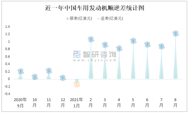 近一年中國車用發(fā)動(dòng)機(jī)順逆差統(tǒng)計(jì)圖