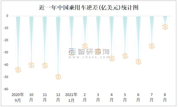 根據中國海關數據顯示:近一年中國乘用車進口金額總體大于出口金額,進出口貿易全部為逆差,逆差規模在2020年12月達到最大,8月逆差規模縮減至最小。