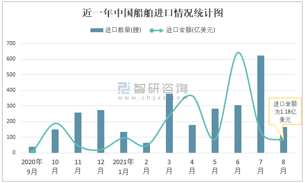 根據中國海關數據顯示:2021年8月中國船舶進口數量為164艘,同比增長70.8%,進口金額為1.18億美元,同比增長1371.2%,2021年8月中國船舶出口數量為371艘,同比增長14.9%,出口金額為13.1億美元,同比下降2.7%;2021年1-8月中國船舶進口數量為2118艘,進口金額為24.2億美元,出口數量為3329艘,出口金額為142.83億美元。