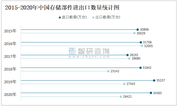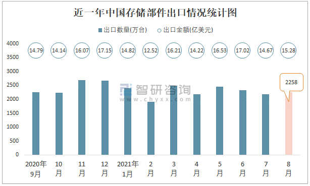 2021年8月中國存儲部件進出口數量分別為3058萬臺和2258萬臺