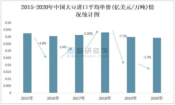 根據(jù)中國海關數(shù)據(jù)顯示:2015-2020年中國大豆進口數(shù)量總體呈上升趨勢,進口金額2019年起大幅度上升;2015-2020年中國大豆進口平均單價2018年增長速度最快,并達到最大值,而2019年中國大豆進口平均單價下降速度最快,下滑了7.7%。