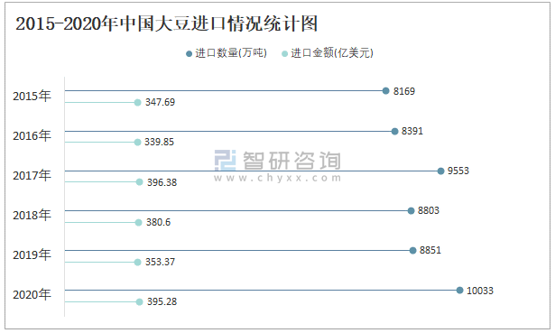 2015-2020年中國大豆進口情況統(tǒng)計圖