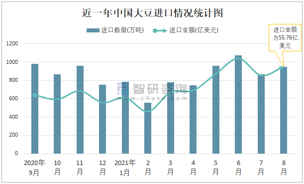 2021年8月中國大豆進口數(shù)量和進口金額分別為949萬噸和55.76億美元