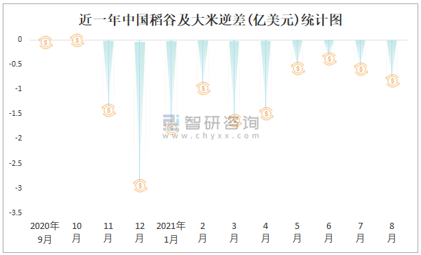 近一年中國稻谷及大米逆差(億美元)統計圖
