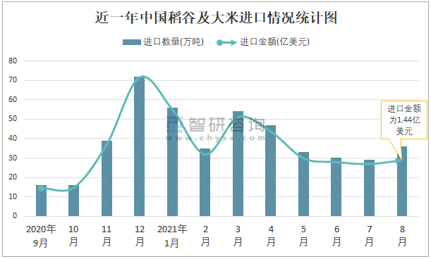 根據中國海關數據顯示:2021年8月中國稻谷及大米進口數量為36萬噸,同比增長167.6%,進口金額為1.44億美元,同比增長140%,2021年8月中國稻谷及大米出口數量為18萬噸,同比增長49.7%,出口金額為0.61億美元,同比增長30.5%;2021年1-8月中國稻谷及大米進口數量為320萬噸,進口金額為14.73億美元,出口數量為169萬噸,出口金額為6.45億美元。
