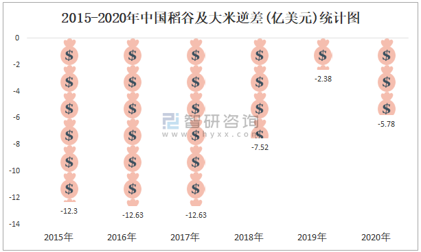 2015-2020年中國稻谷及大米逆差(億美元)統計圖
