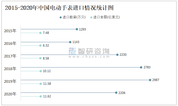 2015-2020年中國電動手表進口情況統計圖