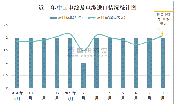 根據(jù)中國海關數(shù)據(jù)顯示:2021年8月中國電線及電纜進口數(shù)量為2萬噸,同比增長9.1%,進口金額為5.02億美元,同比增長30.4%,2021年8月中國電線及電纜出口數(shù)量為21萬噸,同比增長13.1%,出口金額為22.05億美元,同比增長29.9%;2021年1-8月中國電線及電纜進口數(shù)量為15萬噸,進口金額為36.75億美元,出口數(shù)量為153萬噸,出口金額為152.9億美元。