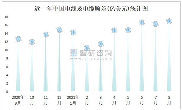 近一年中國電線及電纜順差(億美元)統(tǒng)計圖