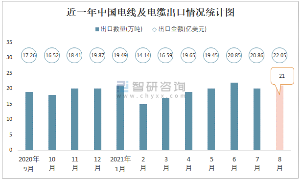 2021年8月中國電線及電纜進出口數(shù)量分別為2萬噸和21萬噸