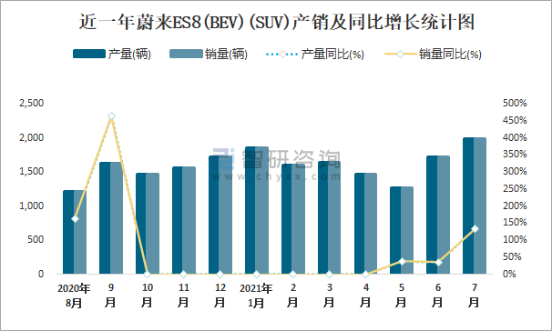 近一年蔚來ES8(BEV)(SUV)產(chǎn)銷及同比增長統(tǒng)計圖