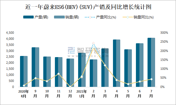 近一年蔚來ES6(BEV)(SUV)產(chǎn)銷及同比增長統(tǒng)計圖