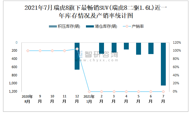 2021年7月瑞虎8旗下最暢銷SUV(瑞虎8二驅1.6L)近一年庫存情況及產銷率統計圖