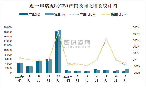 根據中國汽車工業協會數據可知:2021年7月瑞虎8(SUV)產量為690輛,同比下降80.5%,銷量為1759輛,同比下降50.3%,當月產銷率為254.93%;2021年1-7月瑞虎8(SUV)累計產量為6714輛,同比下降51.8%,累計銷量為7658輛,同比下降45.1%,累計產銷率為114.06%;2018-2020年瑞虎8(SUV)產銷量均在2019年跌至最低值,此后有所回升,且近3年總銷量大于總產量,清倉庫存661輛。