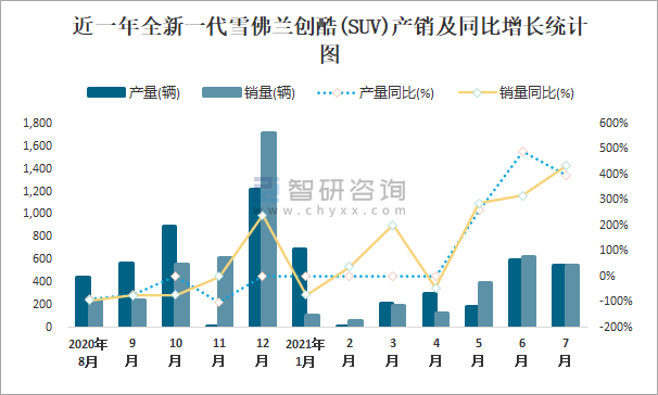 近一年全新一代雪佛蘭創酷(SUV)產銷及同比增長統計圖