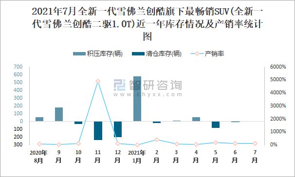 2021年7月全新一代雪佛蘭創酷旗下最暢銷SUV(全新一代雪佛蘭創酷二驅1.0T)近一年庫存情況及產銷率統計圖