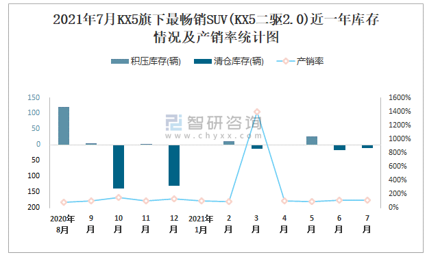 2021年7月KX5旗下最暢銷SUV(KX5二驅2.0)近一年庫存情況及產銷率統計圖