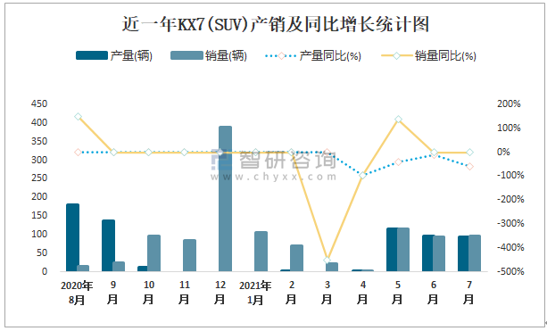 近一年KX7(SUV)產(chǎn)銷及同比增長統(tǒng)計(jì)圖