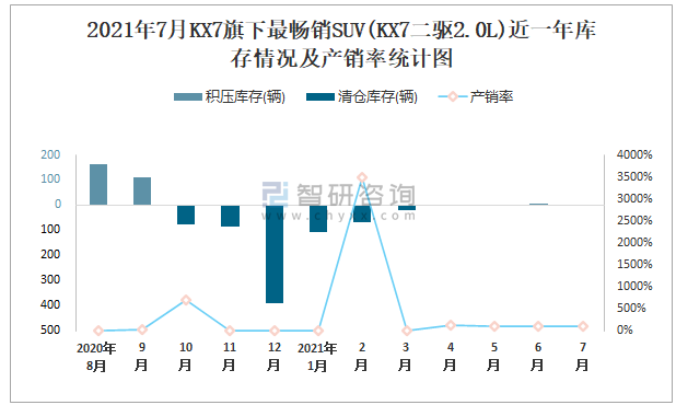 2021年7月KX7旗下最暢銷SUV(KX7二驅(qū)2.0L)近一年庫存情況及產(chǎn)銷率統(tǒng)計(jì)圖