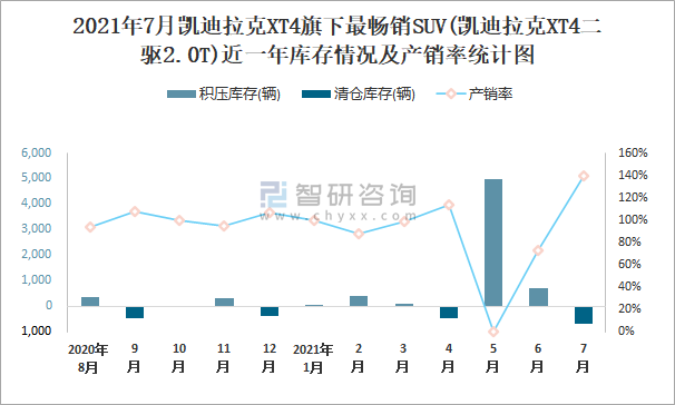 2021年7月凱迪拉克XT4旗下最暢銷SUV(凱迪拉克XT4二驅2.0T)近一年庫存情況及產銷率統計圖