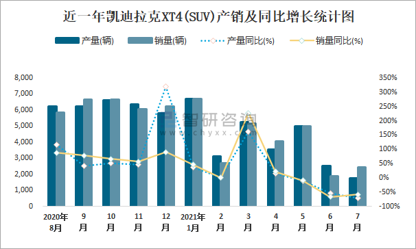 近一年凱迪拉克XT4(SUV)產銷及同比增長統計圖