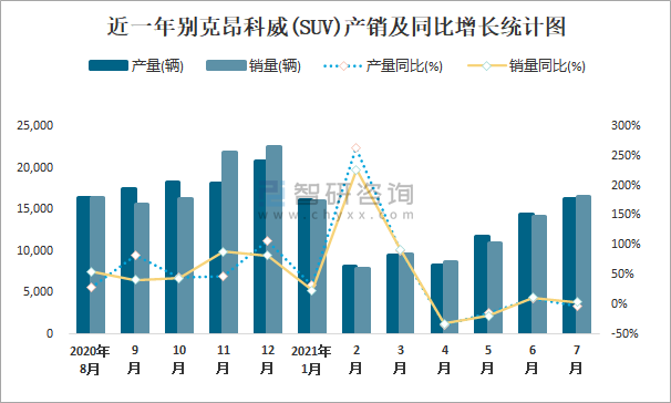 根據(jù)中國汽車工業(yè)協(xié)會數(shù)據(jù)可知:2021年7月別克昂科威(SUV)產(chǎn)量為16327輛,同比下降3.2%,銷量為16500輛,同比增長4.2%,當(dāng)月產(chǎn)銷率為101.06%;2021年1-7月別克昂科威(SUV)累計產(chǎn)量為84692輛,同比增長11.7%,累計銷量為83704輛,同比增長11.2%,累計產(chǎn)銷率為98.83%;2016-2020年別克昂科威(SUV)產(chǎn)銷量均在2019年跌至最低值,此后小幅度回升,且近5年總銷量大于總產(chǎn)量,清倉庫存1938輛。
