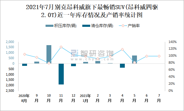 2021年7月別克昂科威旗下最暢銷SUV(昂科威四驅(qū)2.0T)近一年庫存情況及產(chǎn)銷率統(tǒng)計圖