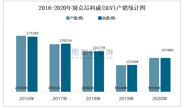 2016-2020年別克昂科威(SUV)產(chǎn)銷統(tǒng)計圖