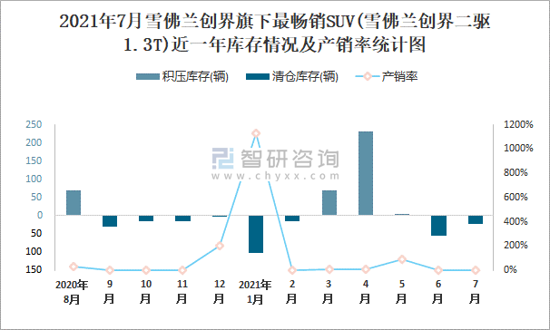 2021年7月雪佛蘭創界旗下最暢銷SUV(雪佛蘭創界二驅1.3T)近一年庫存情況及產銷率統計圖