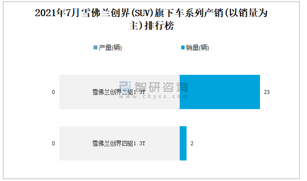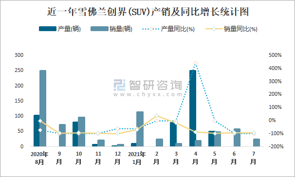 根據中國汽車工業協會數據可知:2021年7月雪佛蘭創界(SUV)產量為0輛,同比下降100%,銷量為25輛,同比下降92%,當月產銷率為0;2021年1-7月雪佛蘭創界(SUV)累計產量為388輛,同比增長94%,累計銷量為298輛,同比下降90.8%,累計產銷率為76.8%;2019-2020年雪佛蘭創界(SUV)產銷量大幅度下滑,且近2年總產量大于總銷量,積壓了庫存178輛。