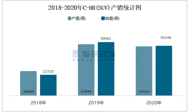 根據中國汽車工業協會數據可知:2021年7月C-HR(SUV)產量為4153輛,同比下降17.6%,銷量為4475輛,同比下降8.7%,當月產銷率為107.75%;2021年1-7月C-HR(SUV)累計產量為33657輛,同比增長27.8%,累計銷量為34417輛,同比增長24.4%,累計產銷率為102.26%;2018-2020年C-HR(SUV)產銷量均在2019年達到最高值,此后小幅度下滑,且近3年總產量大于總銷量,積壓了庫存942輛。