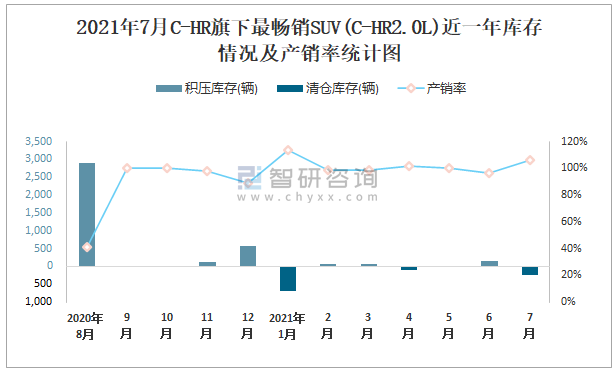 2021年7月C-HR旗下最暢銷SUV(C-HR2.0L)近一年庫存情況及產銷率統計圖