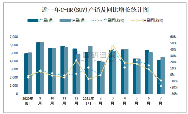 近一年C-HR(SUV)產銷及同比增長統計圖