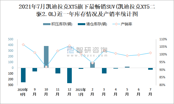 2021年7月凱迪拉克XT5旗下最暢銷SUV(凱迪拉克XT5二驅2.0L)近一年庫存情況及產銷率統計圖