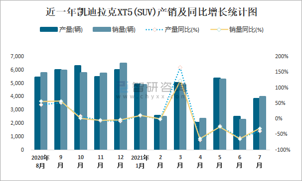 近一年凱迪拉克XT5(SUV)產銷及同比增長統計圖