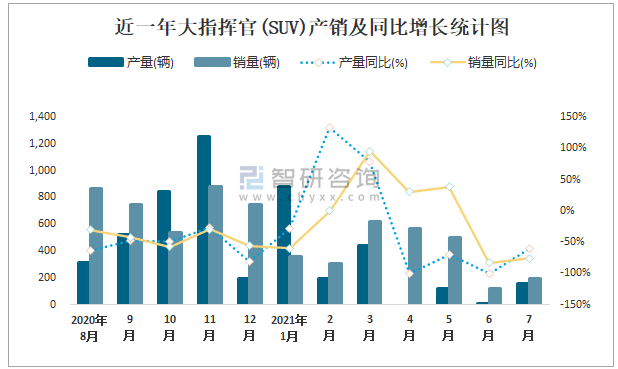 近一年大指揮官(SUV)產(chǎn)銷及同比增長統(tǒng)計圖