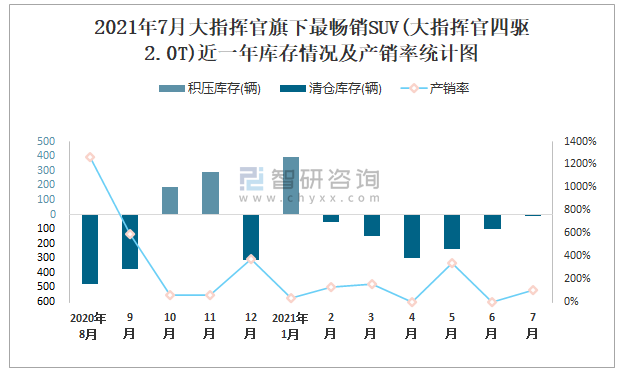 2021年7月大指揮官旗下最暢銷SUV(大指揮官四驅(qū)2.0T)近一年庫存情況及產(chǎn)銷率統(tǒng)計圖