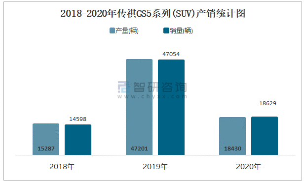 2018-2020年傳祺GS5系列(SUV)產銷統計圖