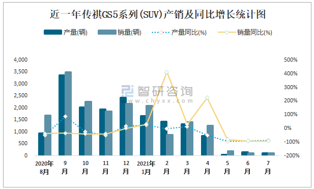 根據中國汽車工業協會數據可知:2021年7月傳祺GS5系列(SUV)產量為104輛,同比下降88.1%,銷量為112輛,同比下降92.5%,當月產銷率為107.69%;2021年1-7月傳祺GS5系列(SUV)累計產量為5541輛,同比下降28.3%,累計銷量為6077輛,同比下降14.7%,累計產銷率為109.67%;2018-2020年傳祺GS5系列(SUV)產銷量均在2019年達到最高值,此后大幅度下滑,且近3年總產量大于總銷量,積壓了庫存637輛。