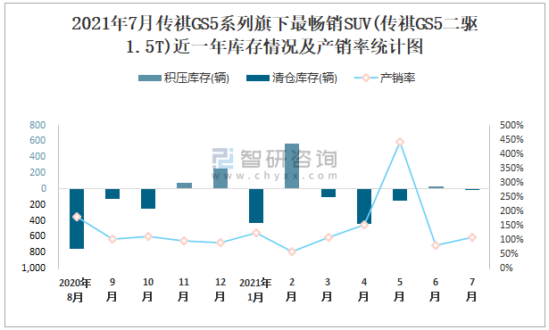 根據中國汽車工業協會數據統計可知:2021年7月傳祺GS5系列(SUV)旗下只有1款祺GS5二驅1.5TSUV在銷售;近一年傳祺GS5二驅1.5T共清倉庫存1335輛,其產銷率存在一定幅度波動,2021年5月產銷率最高(443.18%),清倉庫存151輛,2021年2月產銷率偏低(60.67%),積壓庫存566輛。