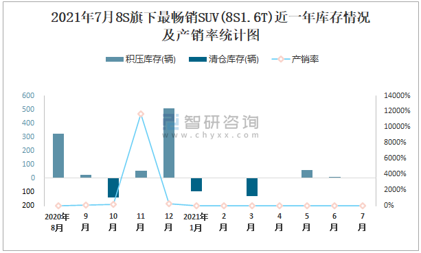 2021年7月8S旗下最暢銷SUV(8S1.6T)近一年庫存情況及產銷率統計圖