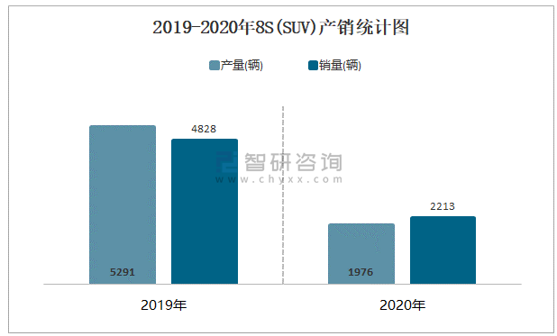 根據中國汽車工業協會數據可知:2021年7月8S(SUV)產量為6輛,同比下降98.1%,銷量為0輛,同比下降100%,當月產銷率為0%;2021年1-7月8S(SUV)累計產量為74輛,同比下降92.4%,累計銷量為226輛,同比下降79.6%,累計產銷率為305.41%;2019-2020年8S(SUV)產銷量有所下降,且近2年總產量大于總銷量,積壓了庫存226輛。