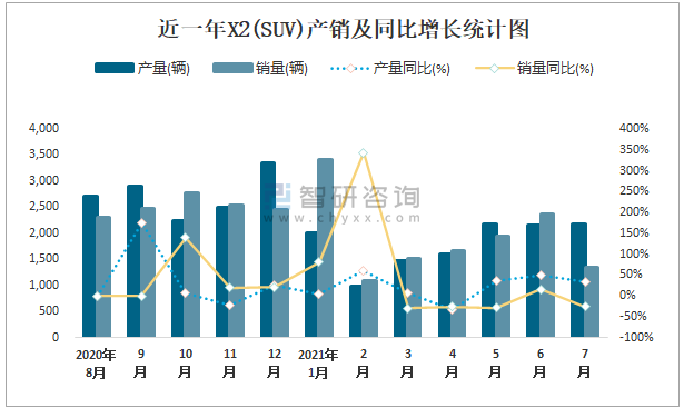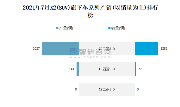2021年7月X2(SUV)產銷量分別為2168輛和1356輛 當月產銷率為62.55%